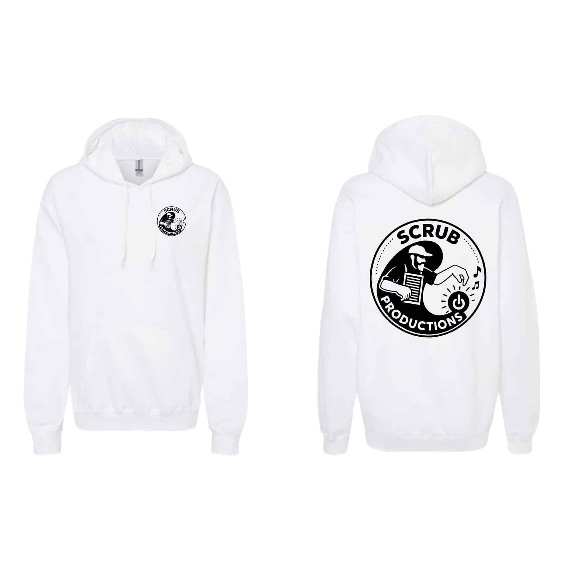 A clean white pullover hoodie printed on the Gildan Softstyle® fleece platform, featuring the official Scrub Productions logo in bold black detail. Designed for comfort, durability, and strong visual contrast.