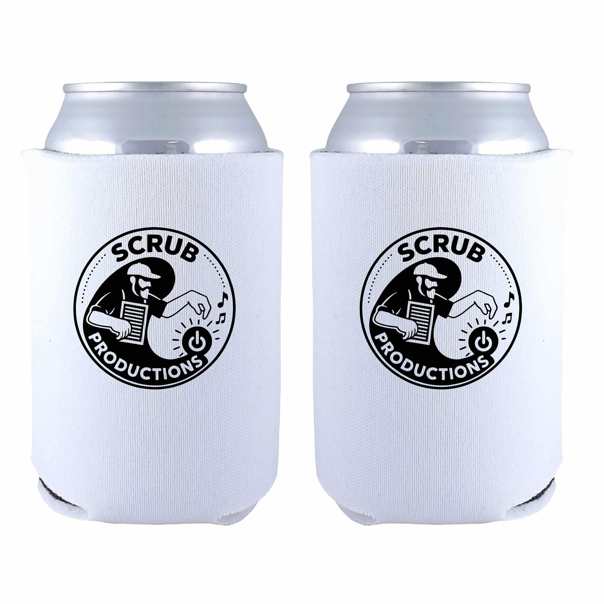 A clean, high-contrast white foam can cooler featuring the official Scrub Productions circular logo in bold black print. Designed for everyday use, this koozie keeps beverages cold while showcasing the brand with a sharp, minimalist look.