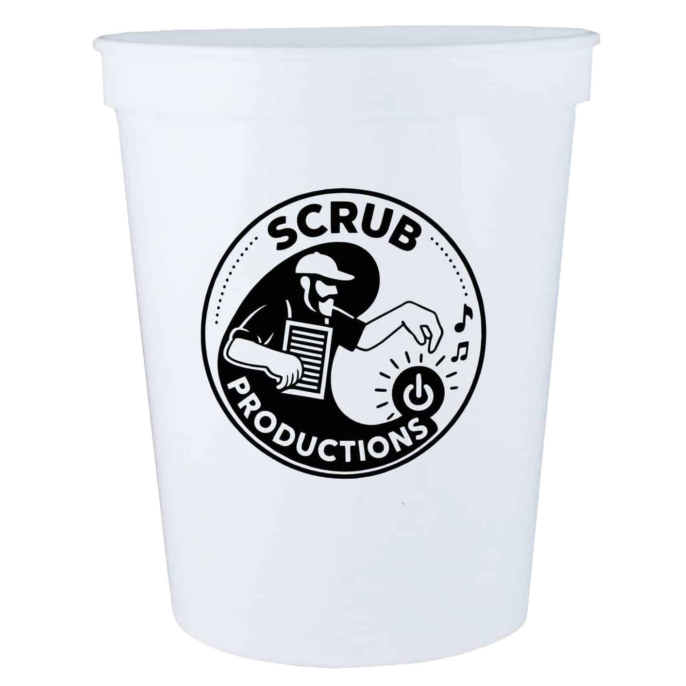 A durable white plastic stadium cup featuring the official Scrub Productions logo in bold black print. Designed for events, shows, and everyday use, this reusable cup delivers clean branding with practical function.