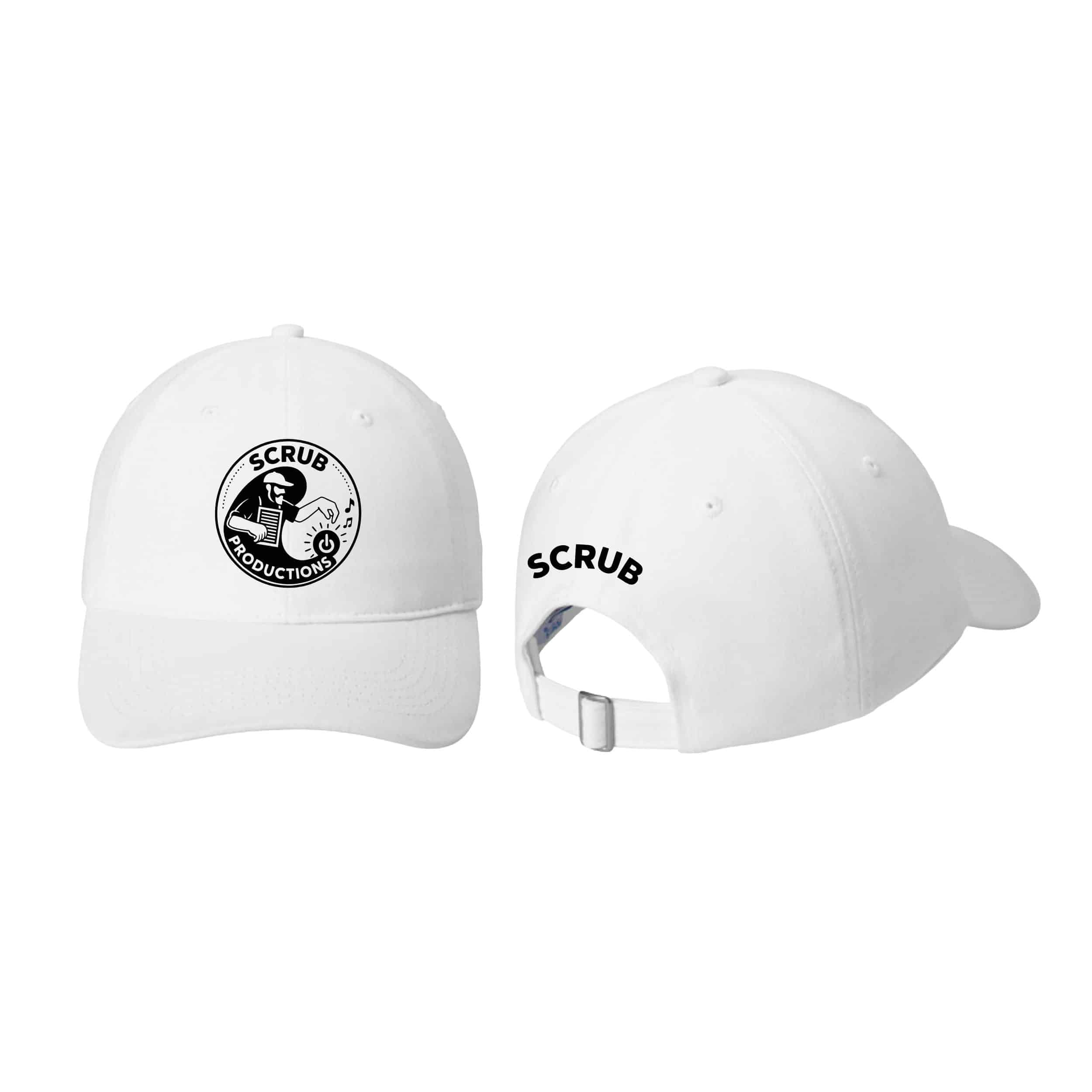 A clean, structured baseball cap featuring the official Scrub Productions logo in sharp black print. Designed for a crisp, high-contrast look, this white twill cap offers everyday durability with a classic silhouette.